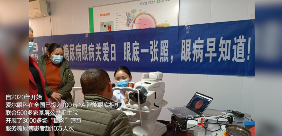 今年,正值爱尔眼科成立20周年。在第16个“联合国糖尿病日”到来之际,爱尔眼科眼底病学组在彭绍民的带领下,构建了“4道防线+4重保障”的糖尿病眼病综合防治体系,并继与中国医师协会公共卫生医师分会开展了“全国基层医疗机构糖尿病视网膜病变培训项目”之后,又再次联合社会各界正式启动了“百城关EYE,百AI护糖”全国AI眼底拍照服务计划,借助百台AI智能眼底相机,依托爱尔眼科分级连锁和糖尿病眼病门诊专科诊疗优势,走入城乡、街道、社区、药店,将AI智能眼底拍照服务和专业诊疗送至患者身边。